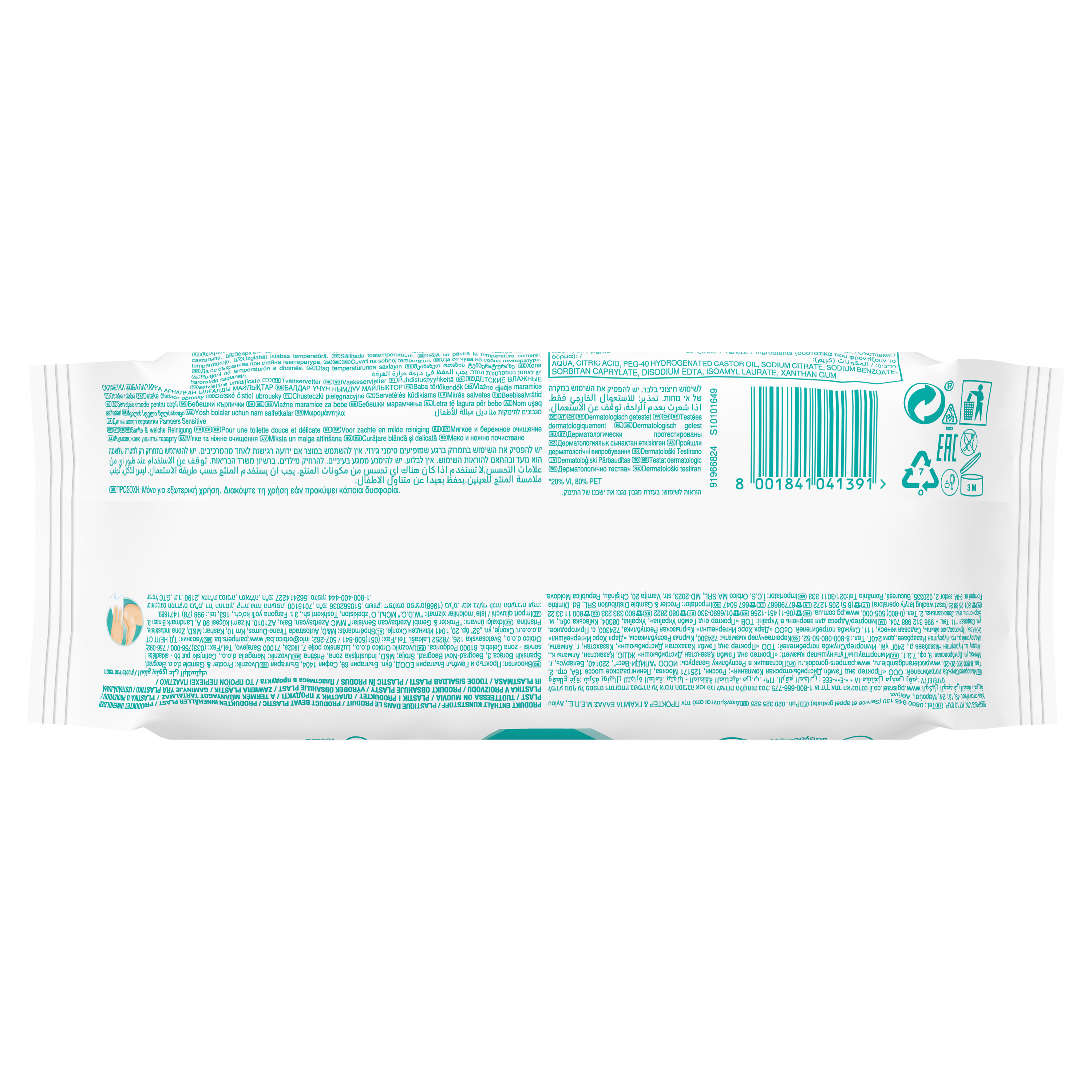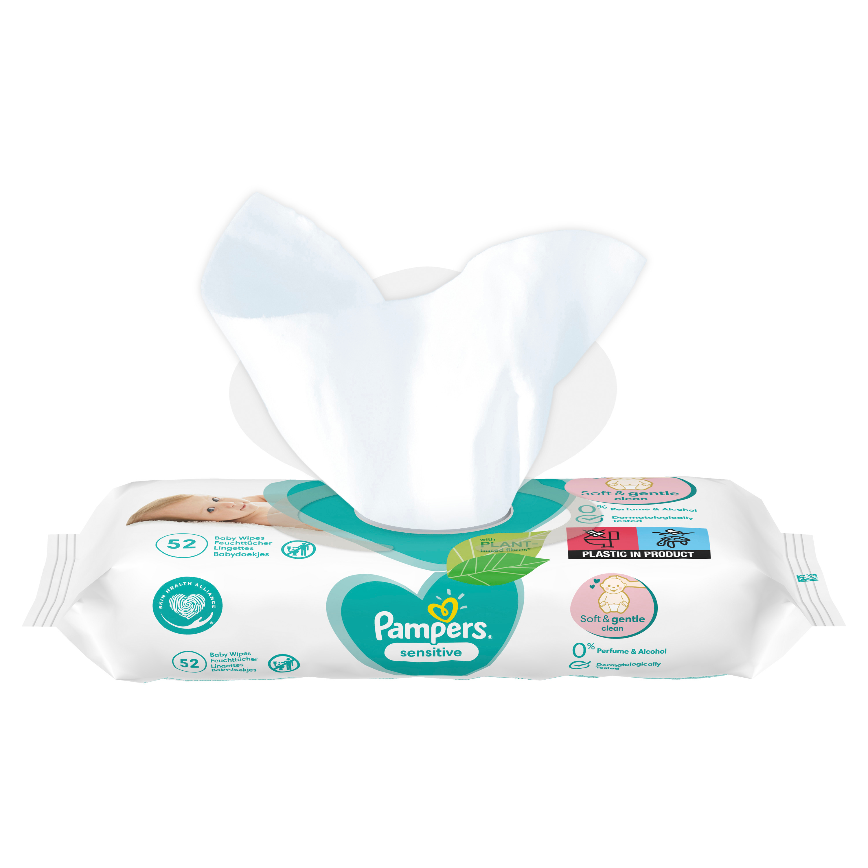 Produktinformationen "Pampers Sensitive Feuchttücher Babyhaut Babyduft Baby Wipes 1 Packung = 52 Feuchttücher 0 % alkohol, 0 % parfüm, 0 % farbstoffe, 0 % parabene, 0 % phenoxyethano "